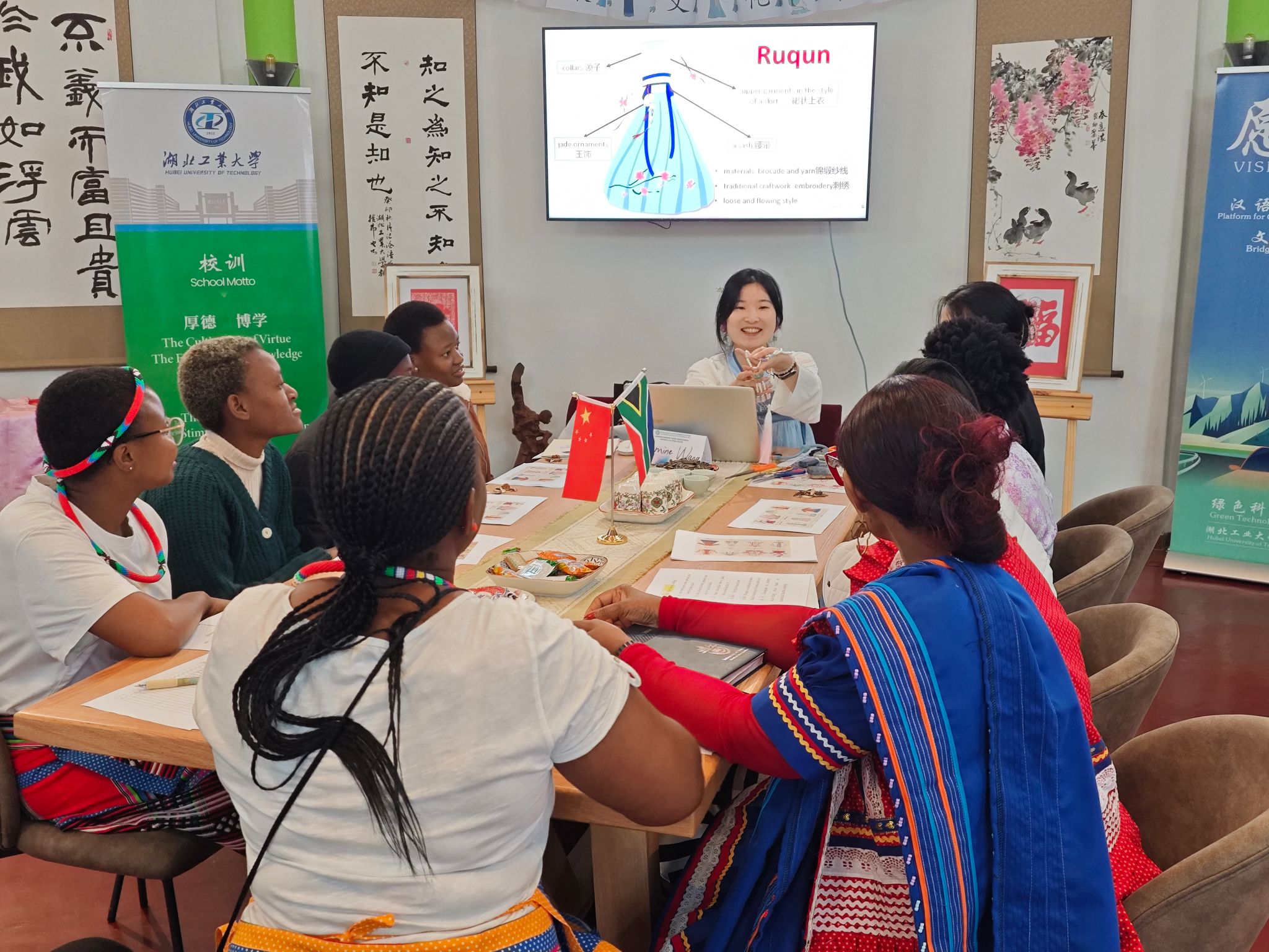 11月8日,绿色科技孔子学院举办了第二场主题为汉服的文化沙龙。志愿者教师王雅君主持本场沙龙。孔子学院全体职工穿上了中国传统服饰,文达大学师生也穿着南非传统服饰前来参加活动。他们一起交流了中国与南非传统服饰的特征与意义,并讨论了全球化时代,传统文化的传承与创新问题。讲座后,所有参与者一起设计了汉服图案,充满创意的作品将中南两国文化联结在一起。