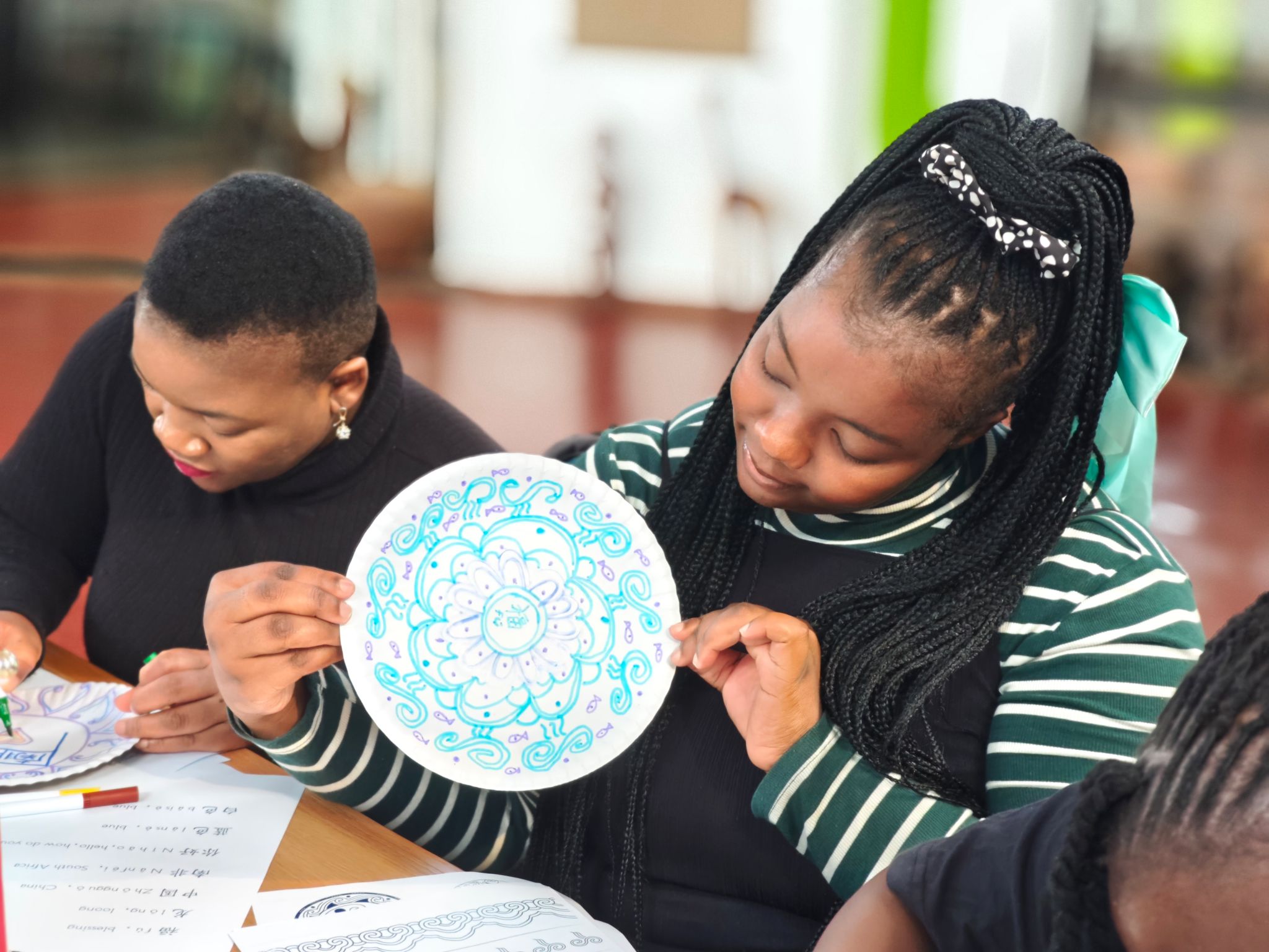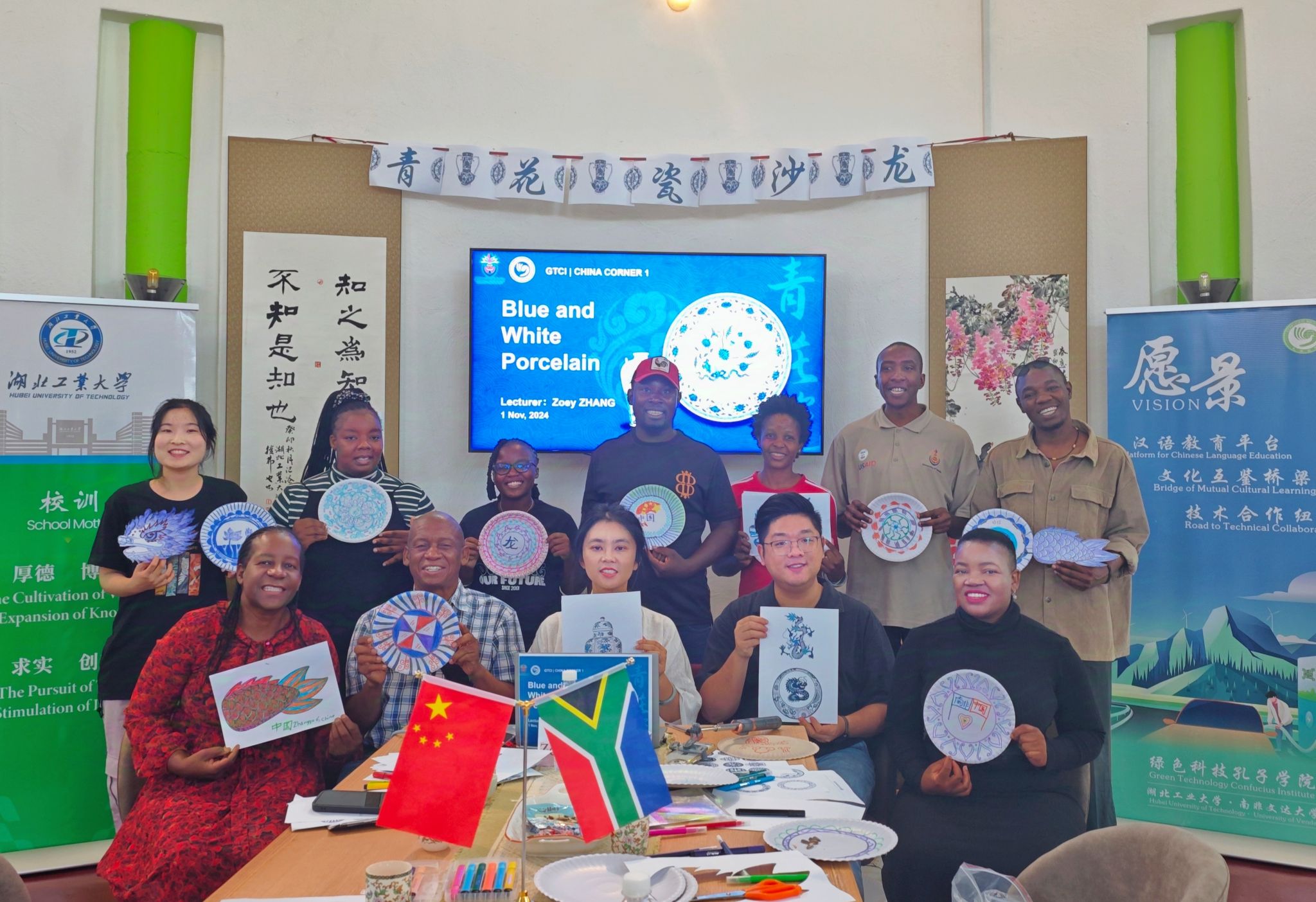 11月1日,GTCI举办了第一场中国角文化沙龙。公派教师张多主持了本场沙龙。她向参与活动的师生介绍了青花瓷的悠久历史、经典纹饰以及它们的象征意义。她通过讲述青花瓷在全球瓷器文化中的重要地位,让活动参与者们对青花瓷的艺术之美和深远影响有了更为直观的认识。在手工活动环节,参与沙龙的师生一起制作了融合中国与南非纹饰风格的青花瓷纸盘画。