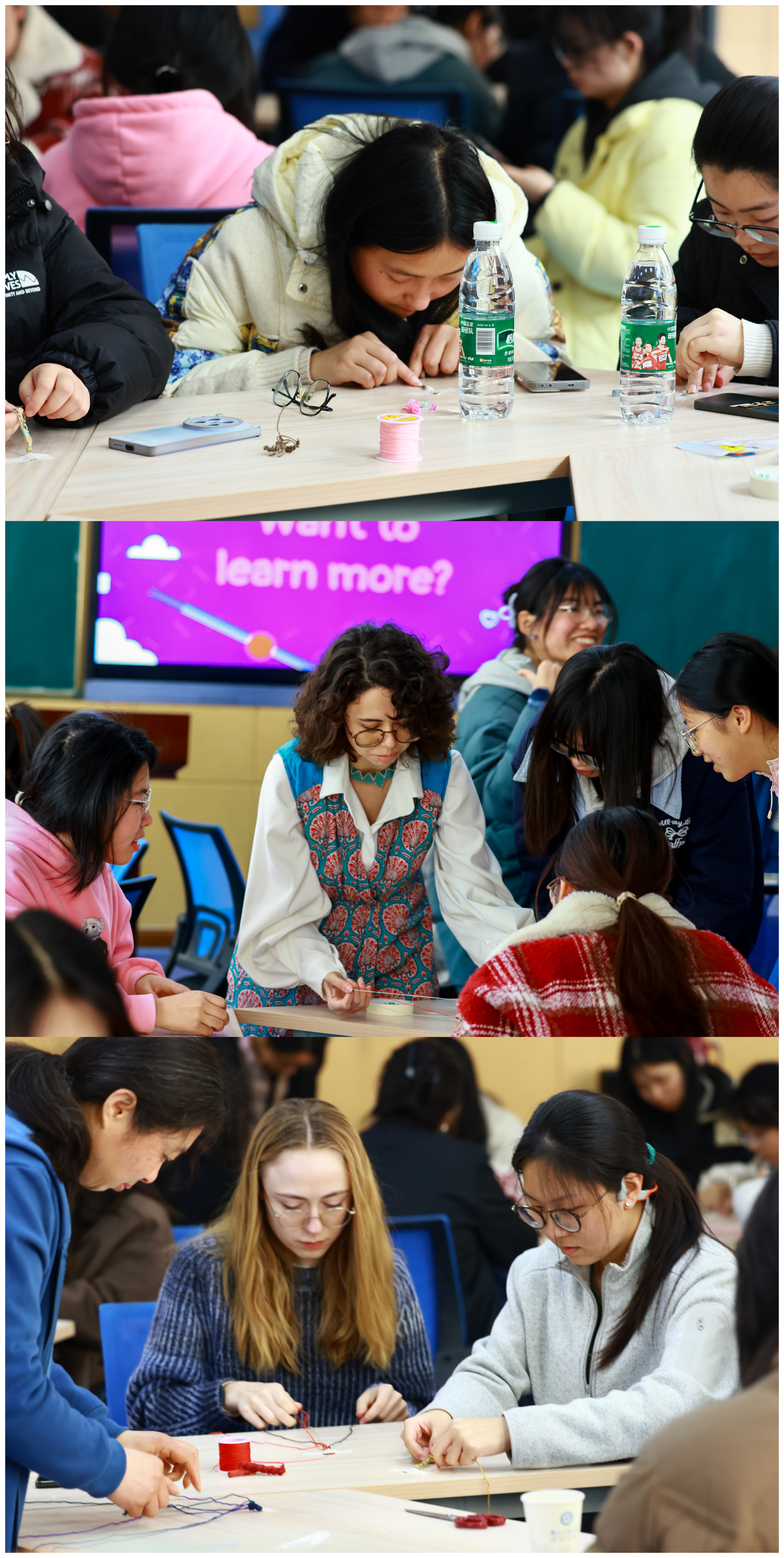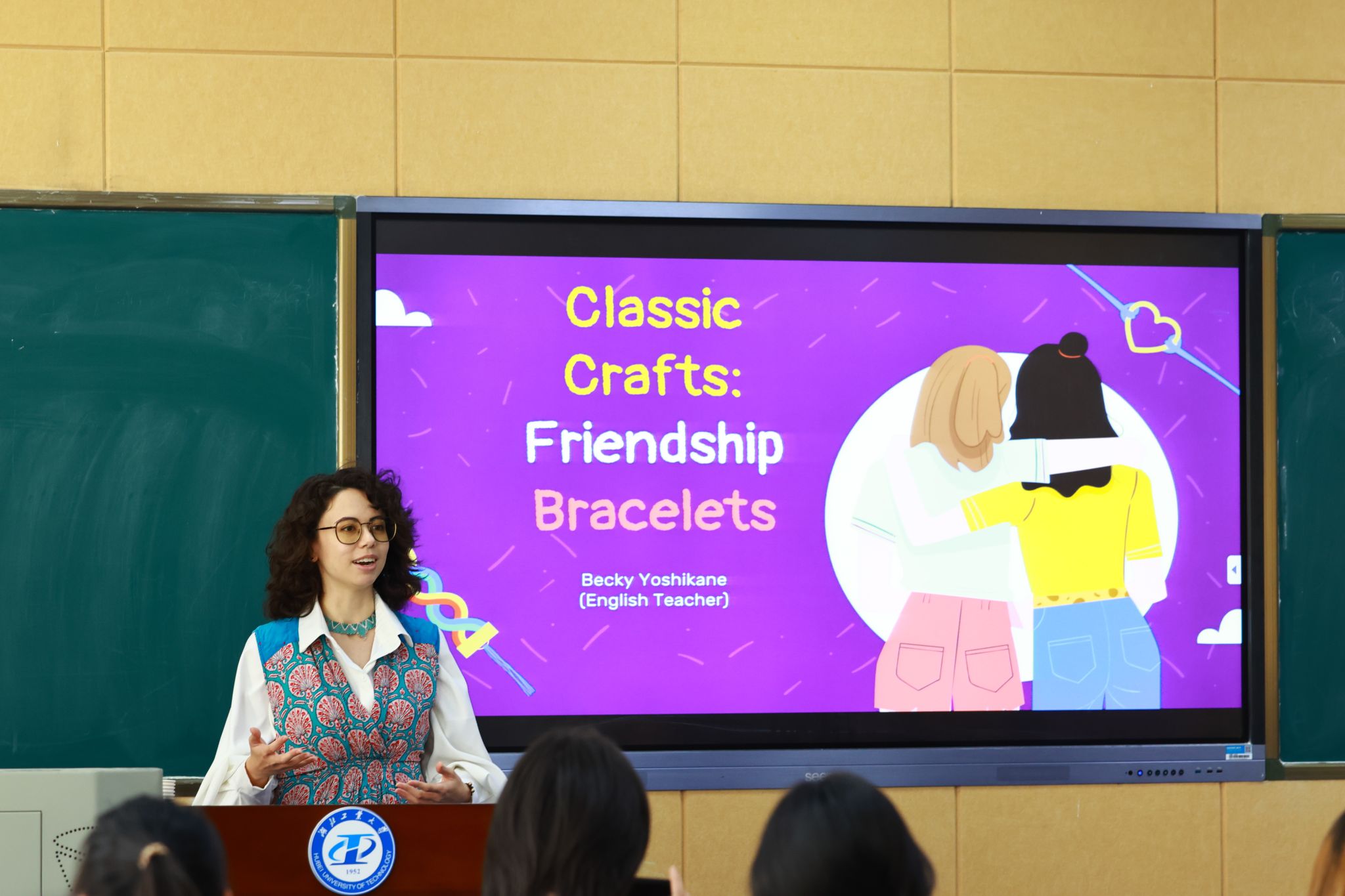 外籍教师Becky为我们讲授了手链的深层意义——它不仅是装饰,更是传递爱与祝福的载体。Becky不仅亲自示范了手链的制作过程,还通过视频展示了每一个细致入微的步骤,让大家对手链制作有了更直观、更全面的了解。