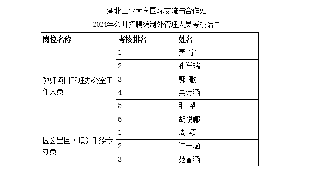附:湖北工业大学国际交流与合作处2024年公开招聘编制外管理人员考核结果
